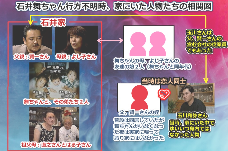 石井舞ちゃん失踪当日の状況を、時系列で振り返ってみます。夏休みが始まったばかりの1991年7月24日、石井家には舞ちゃんの友達姉妹2人(小学4年生と2年生)が遊びに来ており、その夜は一緒に泊まっていました。石井家は父親が営む建設会社の事務所兼自宅で、当時家には両親と祖父母、弟2人に加え、父親の姪(17歳)と住み込み従業員の玉川和弥さん(22歳)の総勢10名が同居していました。(※姪は当日昼から実家に帰省中で不在でした)